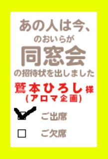 鷲本ひろし(アロマ企画) 編・その参●あの人は今、のおいらが 同窓会の招待状を出しました(仮) 第一回・招待状送付人 鷲本ひろし(アロマ企画) 出席◯