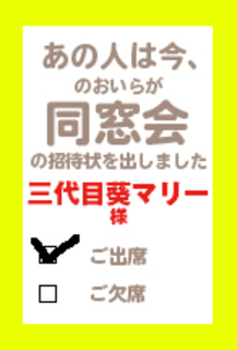 三代目葵マリー編・その壱の壱●あの人は今、のおいらが 同窓会の招待状を出しました(仮)第2回 招待状送付人 三代目葵マリー 出席◯