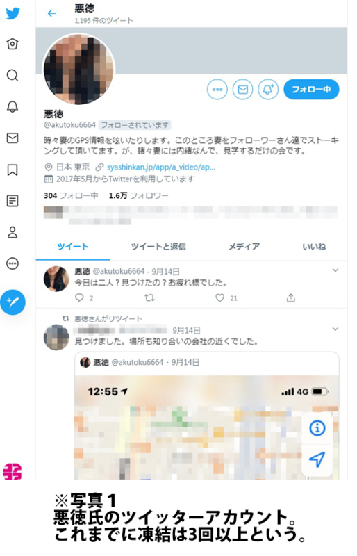 「今、ツイッターを通じて行っているのはGPS投稿だけですね。最初は過去に撮影したハメ撮り画像と動画をあげていたんですが、すぐに凍結されてしまうんで、今のアカウントでは妻のGPS情報だけをアップしてます。隠し撮りはしたことありません。GPSをあげるのは最初はそれを見て妻をナンパしてくれる人がいたら、という寝取られのきっかけ作りでやってたんですが、案外そういう人が現れないし、反対に強引にアプローチする人がいても妻が警戒するだろうというのもあって、今は企画としては続けてますがそこまで期待はしてないですね。ただ、位置情報をアップしたら熱心に妻の後を付けたり、写真を撮ったりして参加して下さる方が一部ですがいて、それを見て喜んでいる方もいそうなんでやってるだけですね」